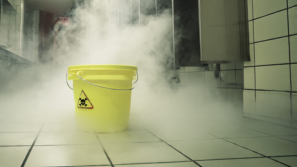 🚫 Amoniaco + Productos ácidos (Limpiadores de baño o desincrustantes): Puede generar gases irritantes o compuestos químicos peligrosos que afectan las vías respiratorias. Ej. Combinar limpiavidrios con amoníaco con limpiadores ácidos para tuberías o baños.
